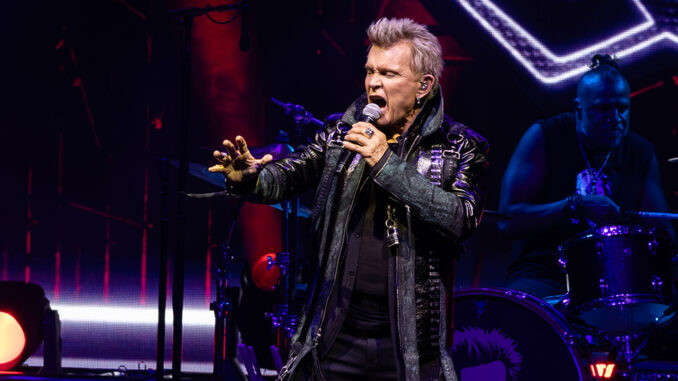 As the lights dimmed, a red outline of Billy Idol‘s face was illuminated at the back of the stage, garnering a thunderous cheer from the audience. As Idol strode out to center stage, they kicked the evening off with “Still Dancing” from Dream Into It, his first new album in over a decade. A number of songs from the new album were performed throughout the evening, including “77,” which features Avril Lavigne on the recorded version. Idol explained that Lavigne was not there to accompany him on this song, so that they were “stuck with little old me.”