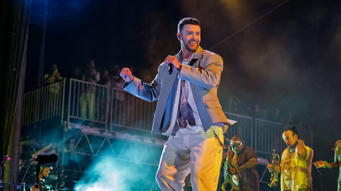 With the confidence and charisma of a seasoned arena performer, he moved seamlessly between eras: from the slow-burning intimacy of “Mirrors” to the genre-bending swagger of “My Love,” to the undeniable crowd-pleaser “Can’t Stop the Feeling,” which sent the entire field into a bouncing sea of hands and cell phones. His setlist was a carefully crafted balance of nostalgia and newness, weaving in and out of several cuts from his catalog, including “Rock your Body” and the emotionally resonant ballad “Cry Me a River,” both of which were met with enthusiastic approval from fans eager to embrace his artistic evolution.