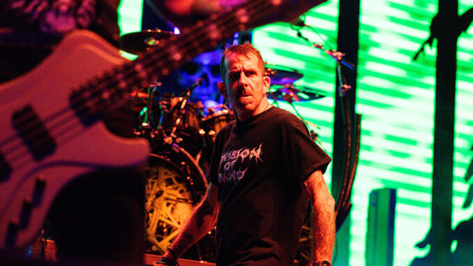 Fit for an Autopsy ignited the stage next with a gear change to a faster pace. Snarling vocalist Joe Badolato waved to the audience moments before ripping into “Lower Purpose” from their The Nothing That Is release. For most in the audience, it was their first time seeing Fit for an Autopsy, but the newness didn’t lessen the mosh pit and serious headbanging by most in the pit. Included in the setlist were the band’s latest single, “The Wretch,” “Hostage,” and “Far From Heaven” from the 2021 album Oh What the Future Holds. Faster, more melodic, yet still insanely grinding and severe, Fit for an Autopsy amped up the volume, the intensity, and the energy of the now very full venue. As revved up as Red Hat Amphitheater was, when Kublai Khan TX unleashed the initial chords of “Darwinism” to start their set, a new height in insanity was found. Moving between violent growling screams and Texas-tinged banter with the crowd, singer Matt Honeycutt made it clear the intensity of the pit was as vital to their energy as milk is to a baby. The pit heard and did not disappoint. Displaying the mantra “all gas, no brakes” throughout their performance, Kublai Khan TX engaged in a bludgeoning set which included “The Hammer” and “Self Destruct,” before closing with “Theory of Mind.” Not the headliner for the evening but Kublai Khan TX performed as if they were, delivering a devastatingly powerful performance. Lamb of God began their set with the stage covered by a front curtain emblazoned with a huge projection of “Lamb of God” in huge lettering. When the intro music stopped and the curtain fell, “Ruin” from their 2003 As the Palaces Burn release opened a set filled with songs from the band’s latest album, Into Oblivion, and fan favorites from the past. Lead vocalist Randy Blythe paced incessantly to all corners of the stage, pausing only to rile up the audience from one of his many front risers on stage. Drummer Art Cruz sat perched high above the stage on a high riser, which held his drum kit crafted like the polished ribs of a prehistoric leviathan.Jarring lights and images flashed across a vertically striped multi-section screen spanning the back of the stage. The song “Sepsis” unleashed a wall of lasers as if focusing the heaviness of the song down upon the audience. Vibrant colors from blue and green mix to blazing red for songs such as “512” added strong visuals to music that most in the audience appeared to know intimately as they sang along. Randy welcomed his young nephew as a special guest at the show and dedicated “Walk With Me in Hell” to him as he experienced his first Lamb of God concert. The just over one-hour set closed with “Redneck” as Lamb of God typically does, leaving the audience breathless.