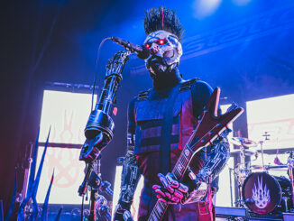 Nothing More keeps things rolling along and they get the crowd really fired up, opening their set with the high-energy song “Turn It Up Like (Stand In the Fire)” from their forthcoming new album. Vocalist Jonny Hawkins even surprises the crowd and gets atop the metal rig called The Scorpion Tail and rides it up high to deliver some wild sounds. They usually save that highlight for the end of the set.Fans have been anxiously waiting for new music and to see them live again and they waste no time showing the band their appreciation with loud cheers. After “Let ‘Em Burn,” Jonny gets behind some drums and kicks off “Christ Copyright” with some rapid-fire drumming amid strobe lights. He is very much the focal point of their shows with his endless energy as he jumps, spins, punches the air, and gives it his all on every song.