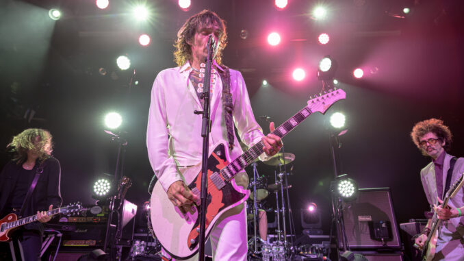 As Irving Plaza’s intimate sold-out show for the legendary UK glam rockers, The Darkness, hit the stage and their hardcore fans were ready. Justin Hawkins and the fellas lit the place up and had their fans fully engaged. It was as if they were performing in your basement due to the size of the room. They kicked it all off with the first song on their latest album, Dreams On Toast, titled “Rock And Roll Party Cowboy,” and the reaction was just as expected. Pure rock and roll fury just filled the room for the remainder of the night.Rufus Taylor killed it on the drums, along with Dan Hawkins shredding those powerful riffs. The man of style was on bass, Frankie Poullain, while the driving force behind the wheel, Justin Hawkins, was front and center. Together, they are the tight, fine-tuned machine called The Darkness. Justin was interactive with the fans as he grabbed one of the photographer’s cameras and started taking photos of the crowd before giving it back, later doing the same with a member of the crowd’s phone. They performed a good mix from their archives, with songs from Permission To Land through to Dreams On Toast.