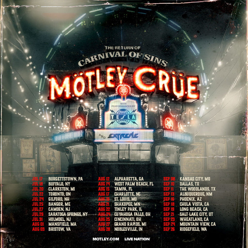 Mötley Crüe are taking to the road once more, with announced tour dates for the US and Canada. The tour will consist of 33 dates. They will be joined by very special guests Tesla and Extreme. The Return of Carnival of Sins Tour kicks off July 17th. 2026 and runs through until September 26th. Tour dates include stops at Dallas, Salt Lake City, Grand Rapids, and Phoenix.