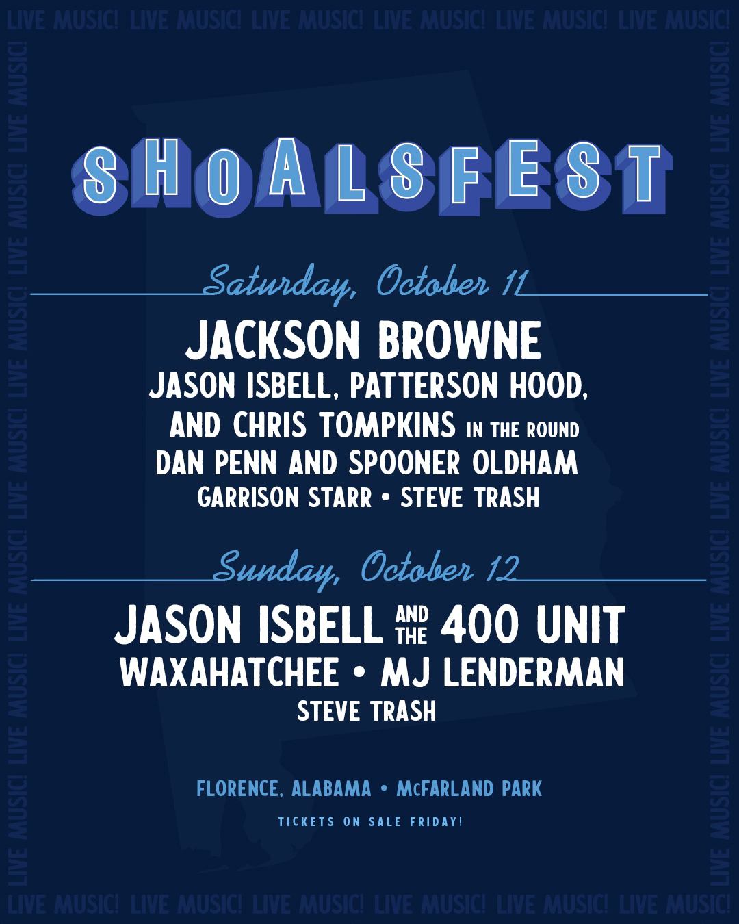 Keeping with the two-day format again this year, the lineup includes Jackson Browne headlining Saturday night, and Jason Isbell and the 400 Unit on Sunday night. Festival-goers will get a double dose of Isbell as he will be joined by Chris Tompkins and Patterson Hood for an in the round session on Saturday. The last ShoalsFest in 2022 hosted an in the round, and we are happy to see this is a part of this year’s lineup too.